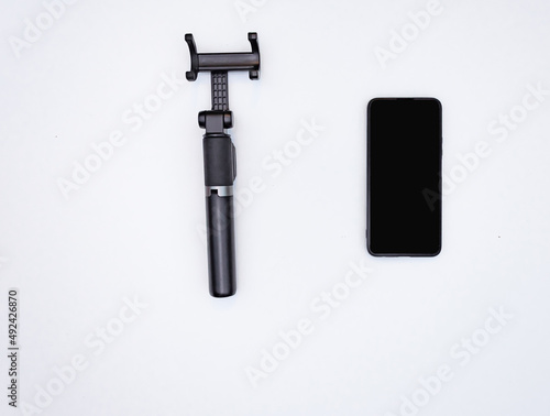 black phone and black phone tripod on white isolated background mockup blog learning online