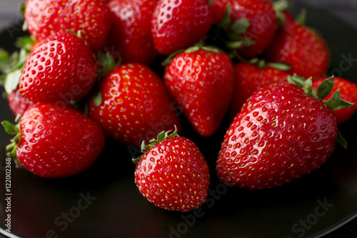 Black plate with ripe strawberries, closeup