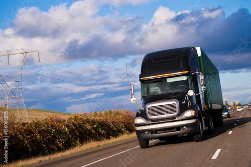 truck, highway, trucking, transportation, semi-truck, transport, black, trailer, cargo, business, trailer, industry, heavy, driving, commercial, land vehicle, capacity, perspective, roadside, road, front view, stylish, logistic, container, classic, carrier, freight, route, rig, heavy duty, horizontal, movement, outdoors, no people, speed, powerful, carrying, running, modern, bulk