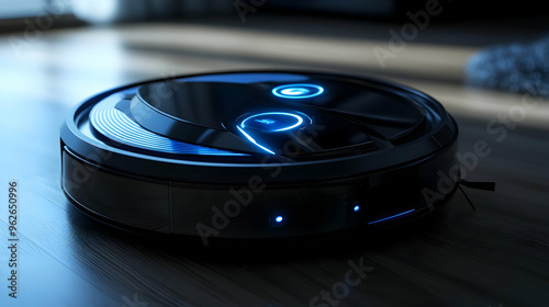 Black Robot Vacuum Cleaner on Hardwood Floor - 3D Illustration