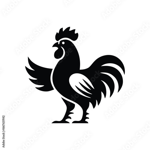 rooster, chicken, fowl, poultry, bird, farm, farming, animal, silhouette, black, icon, logotype, symbol, graphic, vector, illustration, design, minimalist, stylised, monochrome, outline, shape, comb, wattle, tail, domestic, agriculture, mascot, badge, emblem, traditional, modern, abstract, farm animal, country, rural, morning, crowing, isolated, white background, cut-out, art, animal kingdom, food