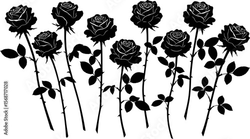 rose, black, silhouette, vector, graphic, illustration, floral, design, element, valentine, day, card, rose, flower, blossom, plant, bloom, garden, flora, leaf, stem, botanical, nature, floral pattern, design element, february 14, line art, romantic, love, elegant, symbol, wedding, beauty, isolated, drawing
