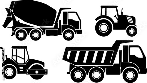 Black Silhouette Icons of Construction and Agricultural Vehicles: Cement Mixer, Road Roller, Dump Truck and Tractor. Editable Black vector silhouettes of heavy-duty vehicles.