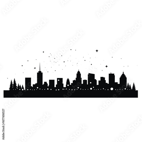city, skyline, silhouette, black, and, white, urban, landscape, city landscape, building, architecture, skyscraper, tree, evergreen, conifer, bird, flying, nature, contrast, minimalist, vector, graphic, design, element, background, isolated, modern, metropolis, horizon, outline