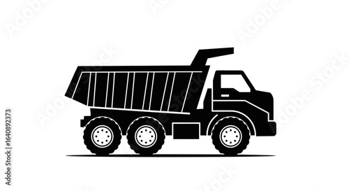 truck, dump truck, dump truck, tipper, lorry, heavy duty, vehicle, transportation, construction, engineering, machinery, transport, cargo, hauling, logistic, delivery, industry, mining, quarry, excavation, offroad, silhouette, black, monochrome, icon, symbol, graphic, design, illustration, vector, clip art, image, automotive, commercial, heavy, powerful, wheel, tire, chassis, cab, bed, container, load, material, dirtied, rock, gravel, sand