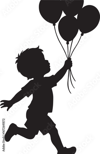 boy, children, silhouette, running, balloon, holding, bunch, happy, joy, celebration, party, childhood, freedom, outdoors, movement, playful, fun, simple, graphic, black-and-white, isolated, white background, vector, illustration, children, youth