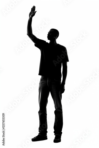 Black silhouette of man with raised hand isolated on white background. Generative ai