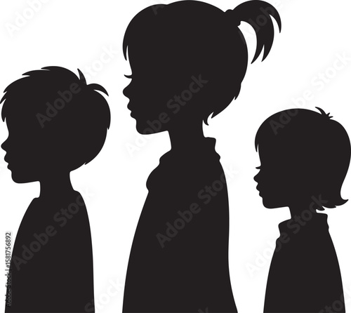 children, silhouette, black, white, profile, boy, girl, ponytail, standing, group, people, children, youth, childhood, friendship, oneness, togetherness, simple, graphic, illustration