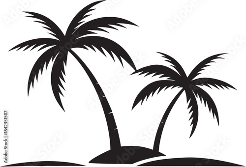 Black silhouette of two tropical palm trees on a deserted island. Vector graphic icon for summer vacation, beach travel, and paradise themes. Isolated design element.