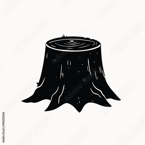 Black silhouette Stump of tree, detailed drawing with grass, moss and mushrooms in cartoon style isometric isolated on white background.