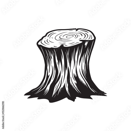 Black silhouette tree stump, Sketch of a tree stump with detailed grain and texture