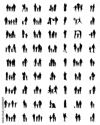Black silhouettes of families in walking on white background