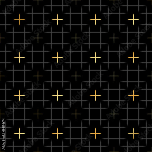 Black squares and gold star geometric pattern in repeat. Fabric print. Seamless background, mosaic ornament, ethnic style. Design for prints on fabrics, textile, surface, paper, wallpaper, interior