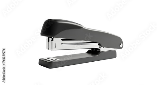 stapler, black, office, tool, paper, staple, metal, fastener, supply, equipment, stationary, desk, work, business, document, organisation, mechanism, spring, lever, hinge, cartridge, refill, load, clip, hold, attach, bind, secure, press, push, handle, footed, arm, head, body, structure, design, element, item, thing, object, single, closeup, detail, view, angle, shape, form, concept