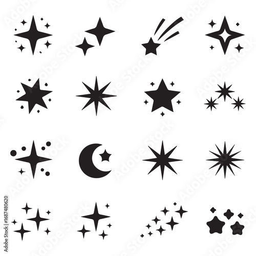 star, star, black, white, icon, icon, set, collection, sparkle, sparkle, shining, shine, celestial, night, sky, moon, crescent, shooting star, vector, illustration, graphic, design, symbol, isolated, element