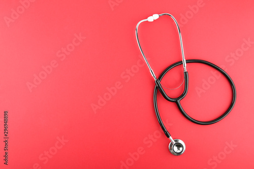 black stethoscope on a red background top view with copy space.