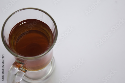 Black tea in a glass cup isolated on a white background