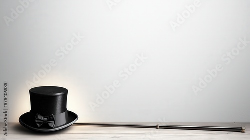 black, top, hat, walking, stick, white, wooden, table, background, design, simple, product, elegant, texture, space, element, graphic, cane, isolated, formal, gentleman, surface, illustration, fashion, minimalist, vintage, antique, event, copy, classic