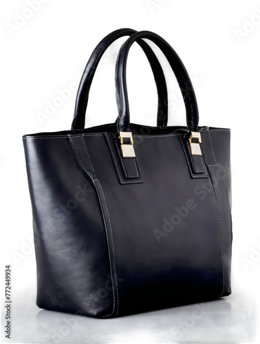 Black tote bag with elegant brown leather handles and black accents isolated on a white background, png.