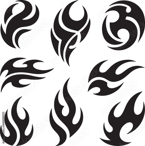 tribal, flames, fire, design, graphic, abstract, black, white, pattern, swirl, curl, element, symbol, tattoo, art, illustration, shape, energy, movement, heat, stylised, modern, bold, sharp, smooth, organic, vector, floral, flower, ornament, decoration, leaf, vintage, decor, plant, curve, scroll, set, nature, wallpaper, ornate
