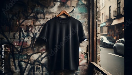 Black T-Shirt Hanging Against Vintage Brick Wall Urban Street Art Background, Fashion Concept, Rustic Window Display, Casual Clothing, Moody Atmosphere, Daylight