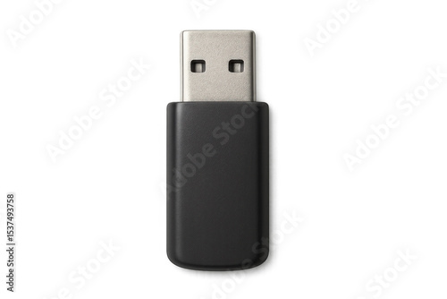 Black usb flash drive close-up, positioned for data transferring against transparent backdrop