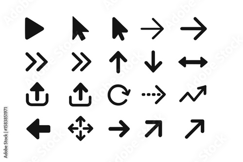 arrow, icon, vector, cursor, set, collection, pointer, navigation, symbol, signs, web, design, interface, flat, modern, simple, black, illustration, graphic, element, buttons, shape, pictogram, infographic, up, down, left, right, next, back, previous, direction, upload, download, share, refresh, reload, growth, trend, move, play, start