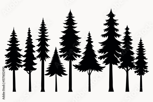 Black Vector Silhouette Set of Evergreen Pine Trees in Forest Landscape – Seasonal Nature Illustration