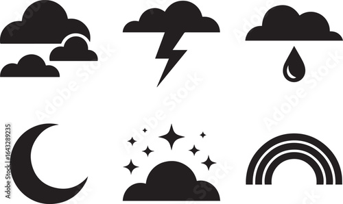 weather, sky, cloud, lightning, rain, dripped, crescent, moon, star, sparkle, rainbow, arc, symbol, icon, graphic, design, illustration, black, white, simple, clean, modern, collection, set, nature, atmospheric, forecast, meteorology, climate, celestial, night, day, storm, shower, bright, clear