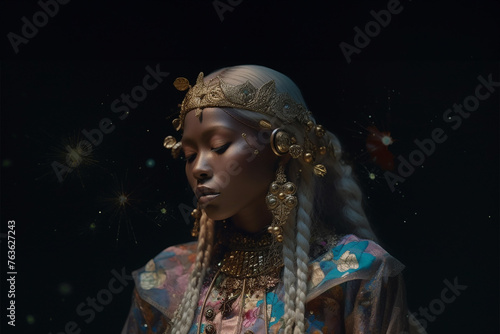 woman, fashion, beauty, face, art, lady, queen, hair, carnival, make-up, person, make-up, model, mask, costume, traditional, fantasy, eye, glamour, dress, horoscope, space, vision, surreal, star, earth, universe, magic, galaxy, star, god, sky, planet, concept, nebula, cosmos, energy, magician, night, style