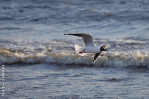 Black-headed gull in the flight over the Wavy water of Baltic sea