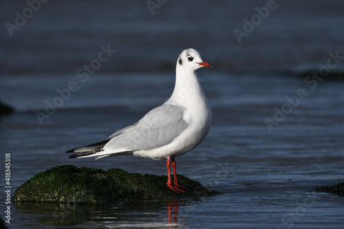 Black-headed gull standing on the rocks on the coast of Katwijk aan zee.