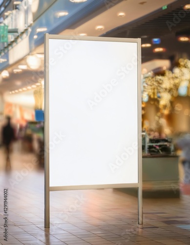 Blank advertising frame in a shopping mall during daylight at a busy location, billboard mockup