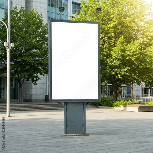 Blank Billboard in Urban Setting, Ready for Mockup. Full shot of an empty billboard positioned in a city plaza, surrounded by modern buildings, lush greenery, and paved walkways.