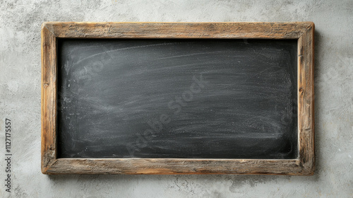 Blank blackboard with a rustic wooden frame, smooth chalkboard texture, placed on a light gray background, perfect for educational or creative themes