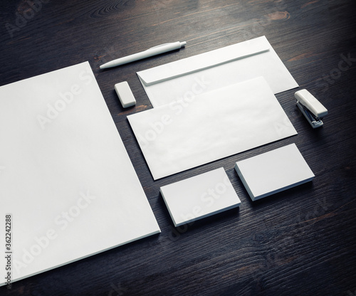 Blank branding template on vintage wooden table background. Photo of blank stationery. Mock-up for design portfolios.