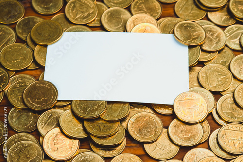 Blank business card or name card with copy space for add text name address and company logo, stack of coin on working table, financial company concept.