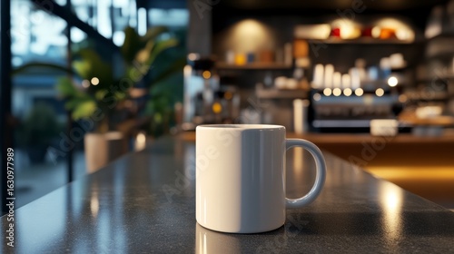 Blank Coffee Mug on Counter in Modern Cafe Interior Background