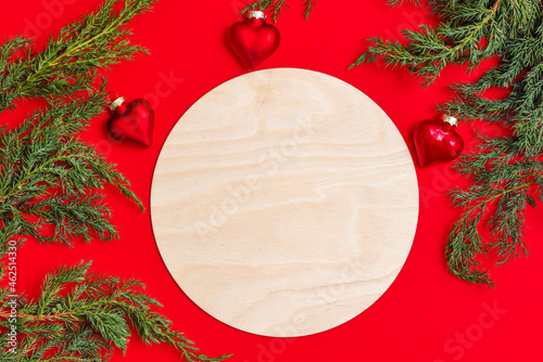 Blank empty round wood sign on red background with christmas tree branch, rustic wooden sign mockup