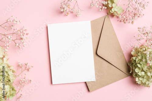 Blank greeting card mockup with brown envelope on pink background surrounded by delicate flowers, copy space for wedding card design