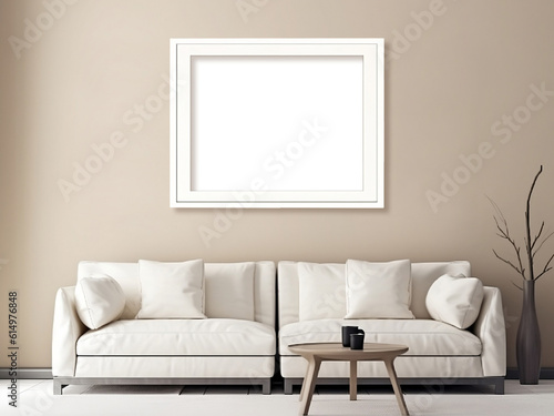 Blank horizontal decorative art transparent frame mock-up in Scandinavian style living room interior, modern living room interior background, beige sofa.