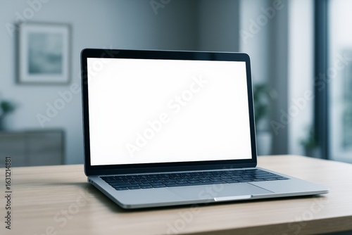 Blank laptop screen on wooden desk in modern interior, ideal for tech mockup, clean design template, or advertising concept background use.