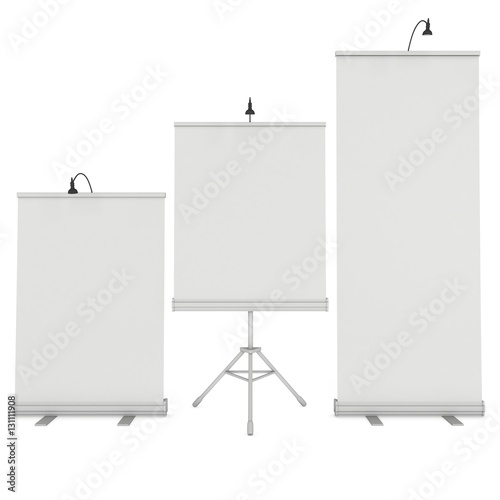 Blank Roll Up Expo Banner Stand Group. Trade show booth white and blank. 3d render illustration isolated on white background. Template mockup for your expo design.