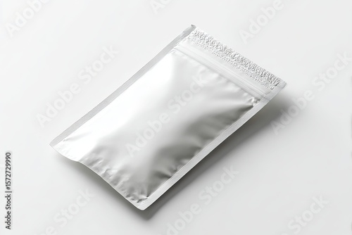 pouch, bag, cardboard box, foil, silver, zip, empty, blank, product, design, template, teabag, storage, container, glossy, metallic, modern, minimalist, clean, isolated, white background, studio shot, topview, overhead, commercial, retail
