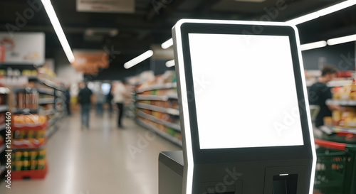 supermarket, kiosk, screen, advertising, technology, retail, store, digital, signage, display, blank, template, marketing, promotion, grocery, shopping, consumer, business, commerce, sale, client, interface, design, information, communication, modern, innovation, point of sale, selfservice, checkout, aisle, product, client, shopping cart, food market, blank screen