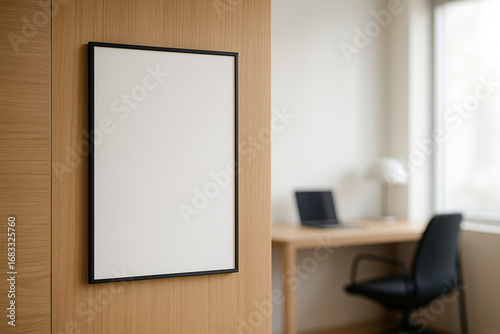 frame, poster, blank, empty, vertical, template, wall, wood, oak, panel, interior, office, modern, minimalist, background, design, decor, workspace, professional, clean, natural light, window, copy space, nobody, simple, business, realistic, scandinavian, gallery