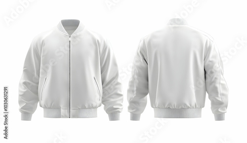 jacket, fashion, clothing, apparel, white, design, template, casual attire, bomber, style, man, woman, unisex, blank, isolated, background, front, back, sleeve, zip, pocket, collar, ribbed, cuff, seam, front view, backview, wear, casual clothes, trendy, stylish, fabric, soft