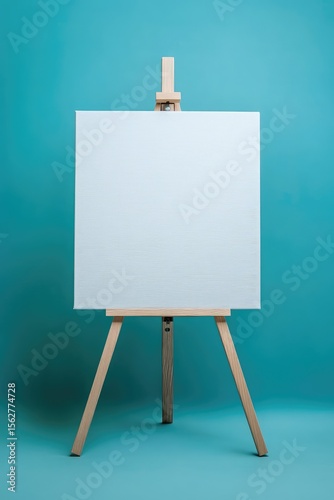 Blank white canvas on a simple wooden easel against a teal backdrop