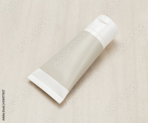Blank white plastic cream tube or gel product mockup template on wooden background.