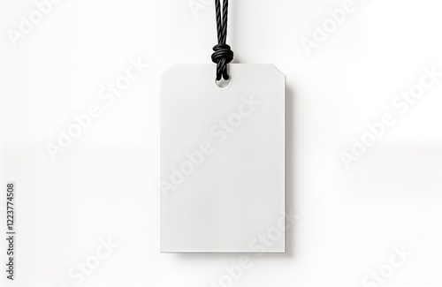 Blank white price tag hangs from black string. Simple design for retail display. Empty tag ready for customization. Studio shot on isolated white background. Versatile for various branding purposes.